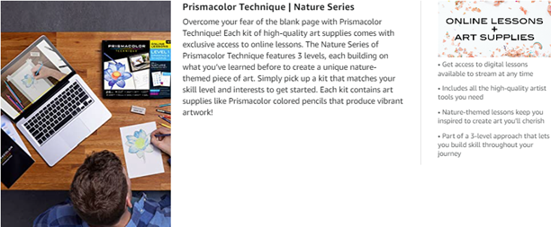 Learn art at your own pace from the comfort of home with Prismacolor Technique. Each Prismacolor Technique set features a unique coupon code for access to digital art lessons you can’t get anywhere else. Instructed by Prismacolor artists, each lesson will teach you how to use the professional-grade art supplies included in the set to create a piece of art you will cherish. The Level 2 Nature Drawing Set is designed for those who want to keep building on their art knowledge. You’ll practice color usage and style while creating a stunning sunset landscape. The set features Prismacolor colored pencils with rich cores for smooth color laydown, and watercolor pencils and brush markers that create brilliant watercolor effects. You’ll also receive brushes, an eraser, a drawing pad, a mini sharpener, a drawing template, a set of instructions, and hours of online content to learn at your convenience!