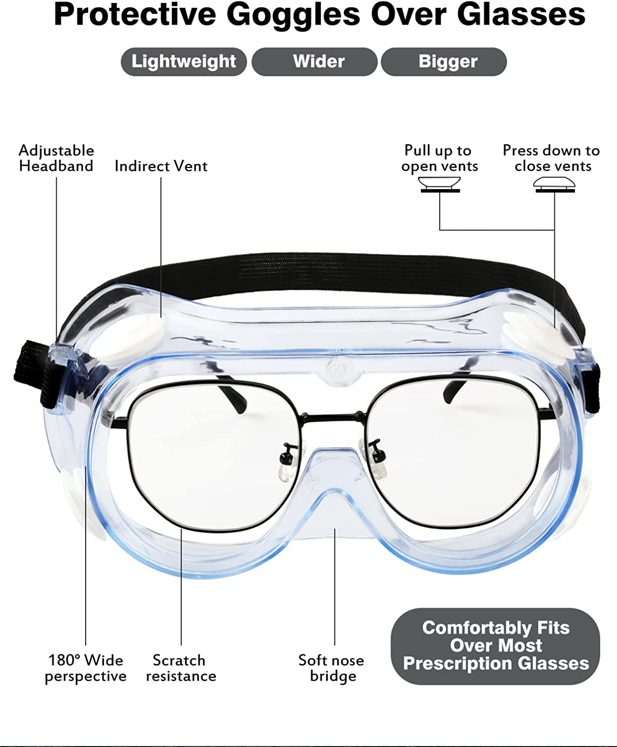 • Adjustable Elastic Strap and Venting Design - Fits over most glasses, adjustable elastic strap design to facilitate the fastening of the head circumference. Four vents allow maximum airflow while protecting against liquids, certain airborne particulates and dust in the eye area.