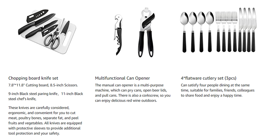 | Included Components | 1*storage bag, 1*cutting board, 1*barbecue fork, 1*slotted tongs, 1*paring knife, 1*chef's knife, 1*wine opener, 1*can opener, 1*ladle, 1*scissors, 1*scraper, 1*slotted turner, 2*barbecue skewers, 2*extendable BBQ forks, 4*flatware cutlery set(3pcs), bag. |