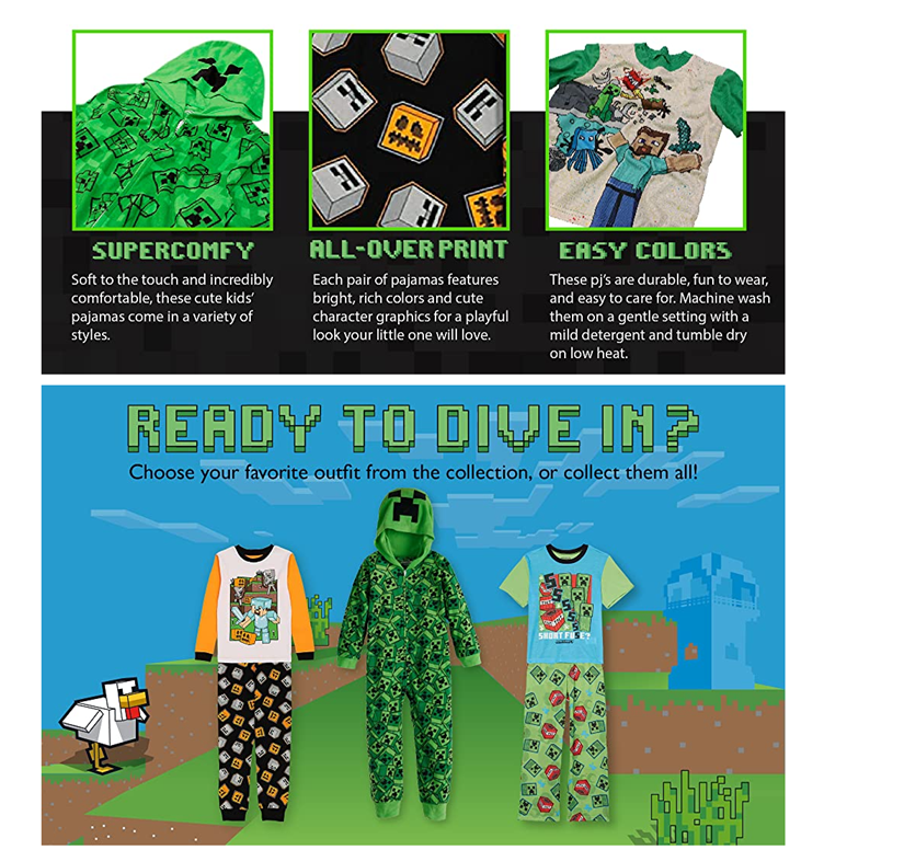 - YEAR-ROUND BOYS’ PAJAMAS: Get your little guy ready for adventures with Steve, creepers, zombies, and more in these fun “Minecraft” boys’ pj’s. He’ll drift off to sleep dreaming about his favorite game. Officially licensed “Minecraft” merchandise