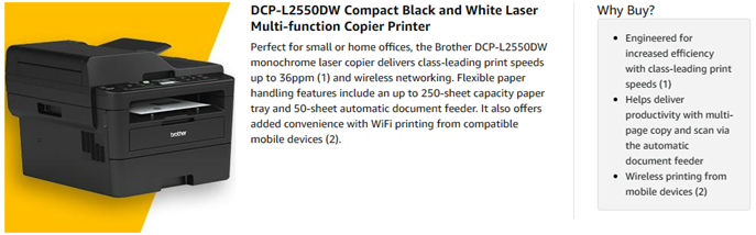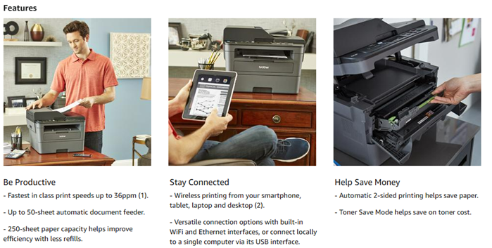 The Brother DCP L2550DW is the ideal choice for the busy home or small office looking for a fast, reliable multi function copier. A replacement for the dependable DCP L2540DW, this new and improved multiple use copier includes a 50 sheet automatic document feeder, which allows multi page copying and scanning, and class leading print speeds of up to 36 pages per minute for increased efficiency. This printer and copier has a reliable Wi Fi connection, which allows printing from wireless devices including desktops, smartphones, laptops, and tablets. For those who prefer hardwire connections, there’s an Ethernet interface for sharing with multiple users on your network. You can also connect locally to a single computer via USB interface. Operating Environment: Temperature 50-91°F. Speed and efficiency are trademarks of the new Brother DCP L2550DW multi purpose digital copier. The 250 sheet paper tray handles letter and legal sized paper, reducing the need for refills. Automatic duplex (2 sided) printing also saves paper and creates professional looking documents for presentations, newsletters, and other common office needs. Help to save money by using Brother Genuine high yield replacement cartridges (TN 760), which are available through Amazon (also compatible with TN 730 replacement toner cartridge). The Brother Digital Multi Purpose Copier comes with a one year limited warranty and free at your side support, online or via phone or live chat, for the life of your printer. At Brother, we want to ensure that your experience with us is exceptional. If your home or small office is looking for an efficient and user friendly digital copier, add the Brother DCP L2550DW to your Amazon shopping cart today. (1) Based on competing in class monochrome laser multifunction printers under 300 dollars. Print speed specifications gathered from manufacturer websites as of 1/9/2017.(2) Requires connection to a wireless network.(3) TN 760 High Yield vs. TN 730 Standard Yield. Up to two times more prints and lower printing costs based on yields and MSRP. Standard Yield and High yield cartridges sold separately.(4) Approx. toner cartridge yield in accordance with ISO/IEC 19752 (letter/A4).(5) Reprinted from PCMag with permission. Copyright 2017 Ziff Davis, All Rights Reserved.(6) Approx. 300 pages per month in accordance with ISO/IEC 19752 (Letter/A4) using the 2 toners provided in box.(7) The mobile device must have NFC capability and run Android OS 4.4 or later.