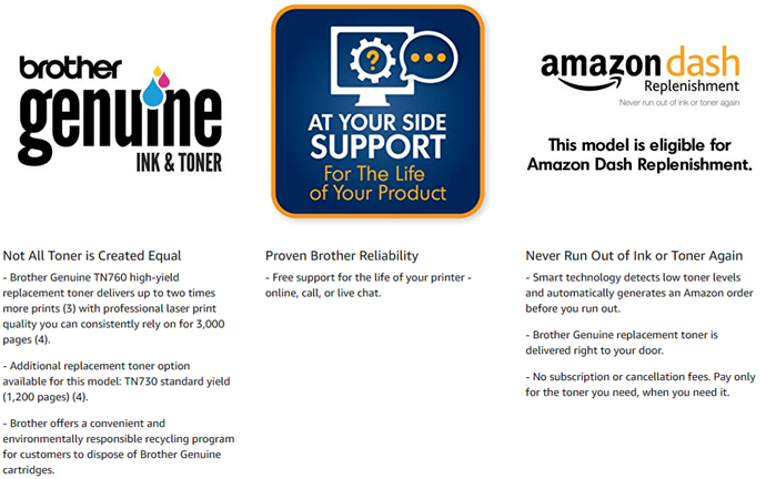 • Save up to 50% on toner with Refresh EZ Print Subscription Service(1). For one low monthly payment, get Brother Genuine Toner delivered right to your door, before you need it.  Up to 4 months free trial included(2).  Plus get 1,000 bonus pages when you enroll within 7 days of setup