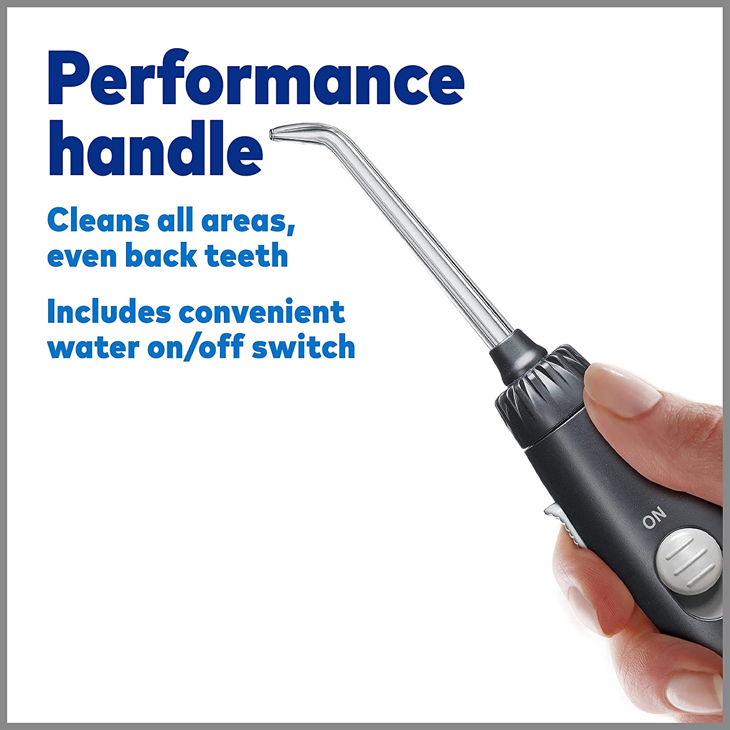 HIGH VOLUME RESERVOIR AND SLIM HANDLE: Holds 22 ounces for 90 seconds of use, no refilling required. Small maneuverable handle makes it easy to floss all areas including back teeth and includes a convenient water on/off switch.