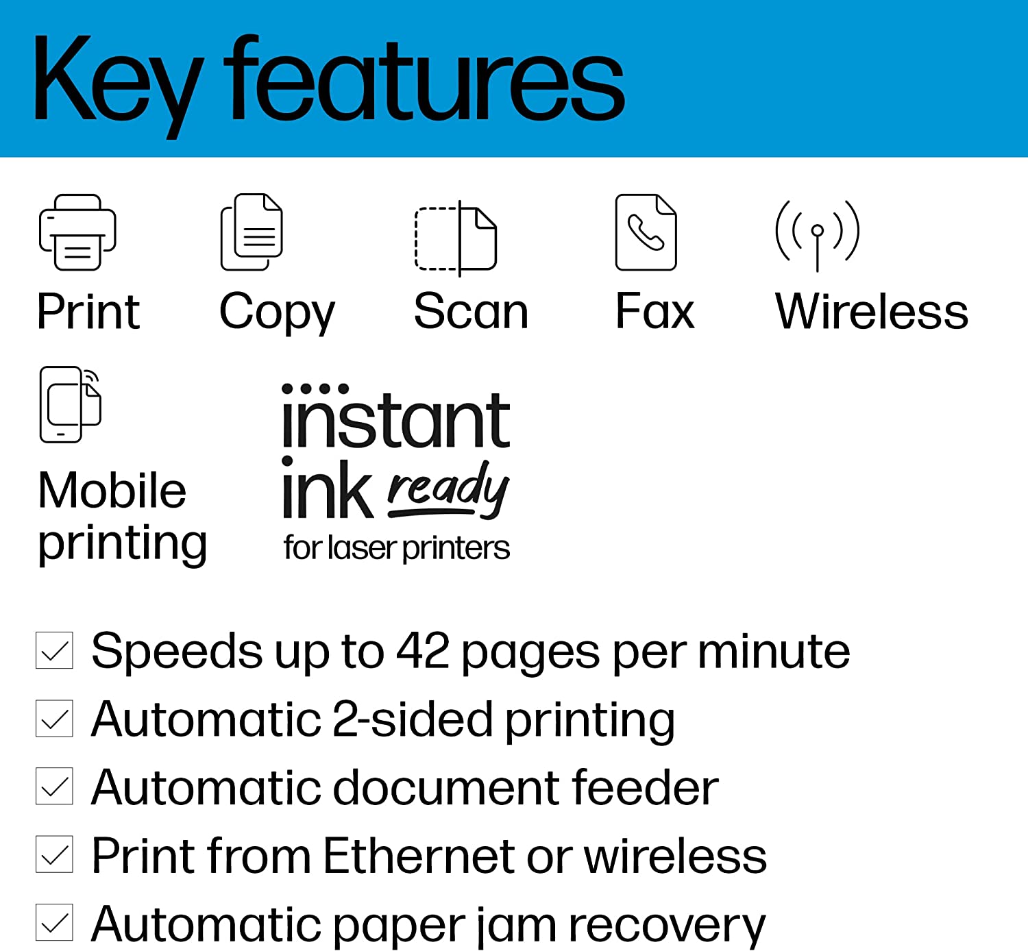 SUPER FAST, SUPER EASY – Blazing fast print speeds up to 42 pages per minute, auto paper jam recovery and self-healing Wi-FiTM. Monitors toner usage with optional automatic shipments with Instant Ink for lasers.