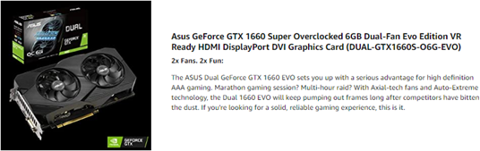 ASUS GeForce GTX 1660 Super Overclocked 6GB Dual-Fan Evo Edition VR Ready HDMI DisplayPort DVI Graphics Card (DUAL-GTX1660S-O6G-EVO)