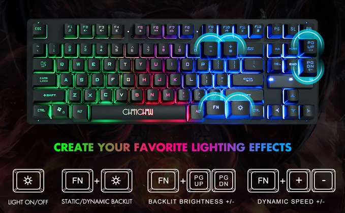• 【Rainbow LED Keyboard】There are 2 lighting modes and 3 levels of brightness for you to choose from. ☼: Static backlight/off; FN+ ☼: Dynamic backlight. Fn+PgUp: Adjust brightness plus; Fn+PgDn: Adjust brightness reduction. FN+ +/-: Adjusts the speed of the dynamic backlight. Please note that this keyboard backlight cannot be changed to one color.