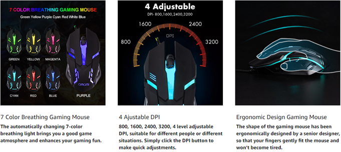 • 【Wired Gaming Mouse】The USB wired gaming mouse has a high-precision sensor and low-friction PTFE feet to give you precise and smooth control. Four levels of DPI (dots per inch) can be easily switched (800/1600/2400/3200). 6 buttons (2 side buttons). Long press the DPI button to switch between 7-color breathing/red light. Gaming mouse size: 5.23*2.75*1.57 inches.