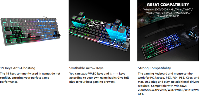 • 【HIGH PERFORMANCE MEMBRANE KEYBOARD】12 multimedia keys to facilitate your gaming operation or work efficiency. Interchangeable WASD keys and locking WIN key function improve your gaming performance. With 19 anti-collision keys, every click won't be lost, ensuring smooth typing.