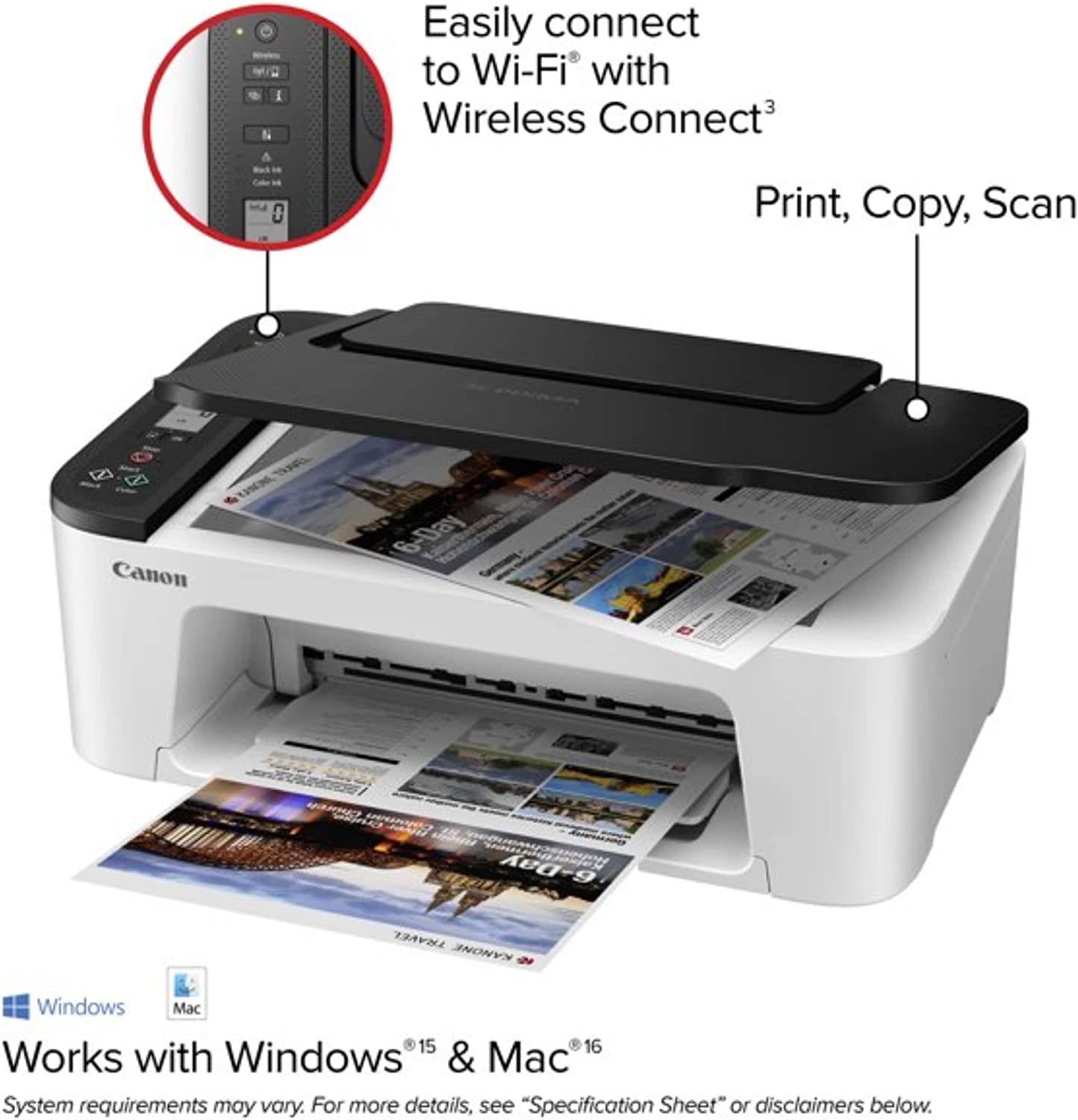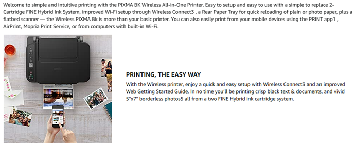 • PRINTING MADE EASY - With the PIXMA Printer, enjoy a quick and easy setup with Wireless Connect and an improved Web Getting Started Guide. In no time you’ll be printing crisp black text & documents, and vivid 5"x7" borderless photos5 all from a two FINE Hybrid ink cartridge system.