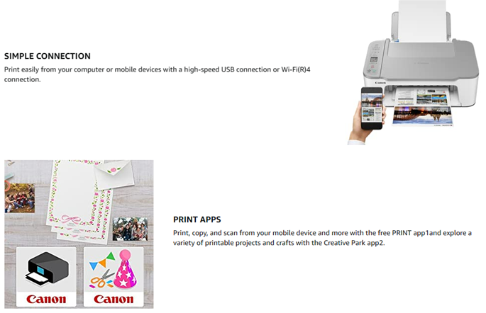 • SIMPLE CONNECTIVITY - Print easily from your computer or mobile devices with a high-speed USB connection or Wi-Fi connection. You can also easily print from your mobile devices using the Canon PRINT app, AirPrint, Mopria Print Service, or from computers with built-in Wi-Fi.