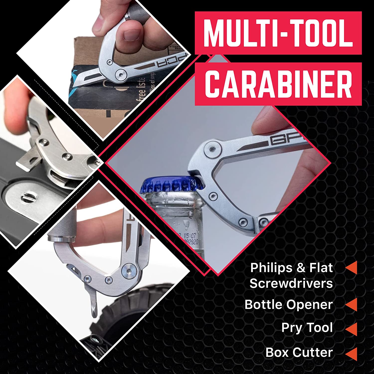 • VERSATILE UTILITY TOOL - Always be prepared for everyday tasks and outdoor activities with our keychain carabiner. This EDC carabiner works as a handy multi-tool. Use it as a bottle opener, dog leash handle, box cutter, pry tool and more.