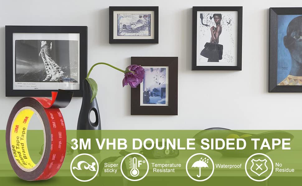• 【High quality heavy duty double sided tape】- Proven Reliability from VHB Mounting Tapes. Very high bonding tape works extremely well on smooth surfaces and widely used for LED strip lights, trims, car registration plates, name plates, address plaques, signs, emblem, car holders, mosquito/bug screen, metal mailbox, mirrors, hangers, tooth brush holder, photo frames, power strip and other automotive home office decorations.