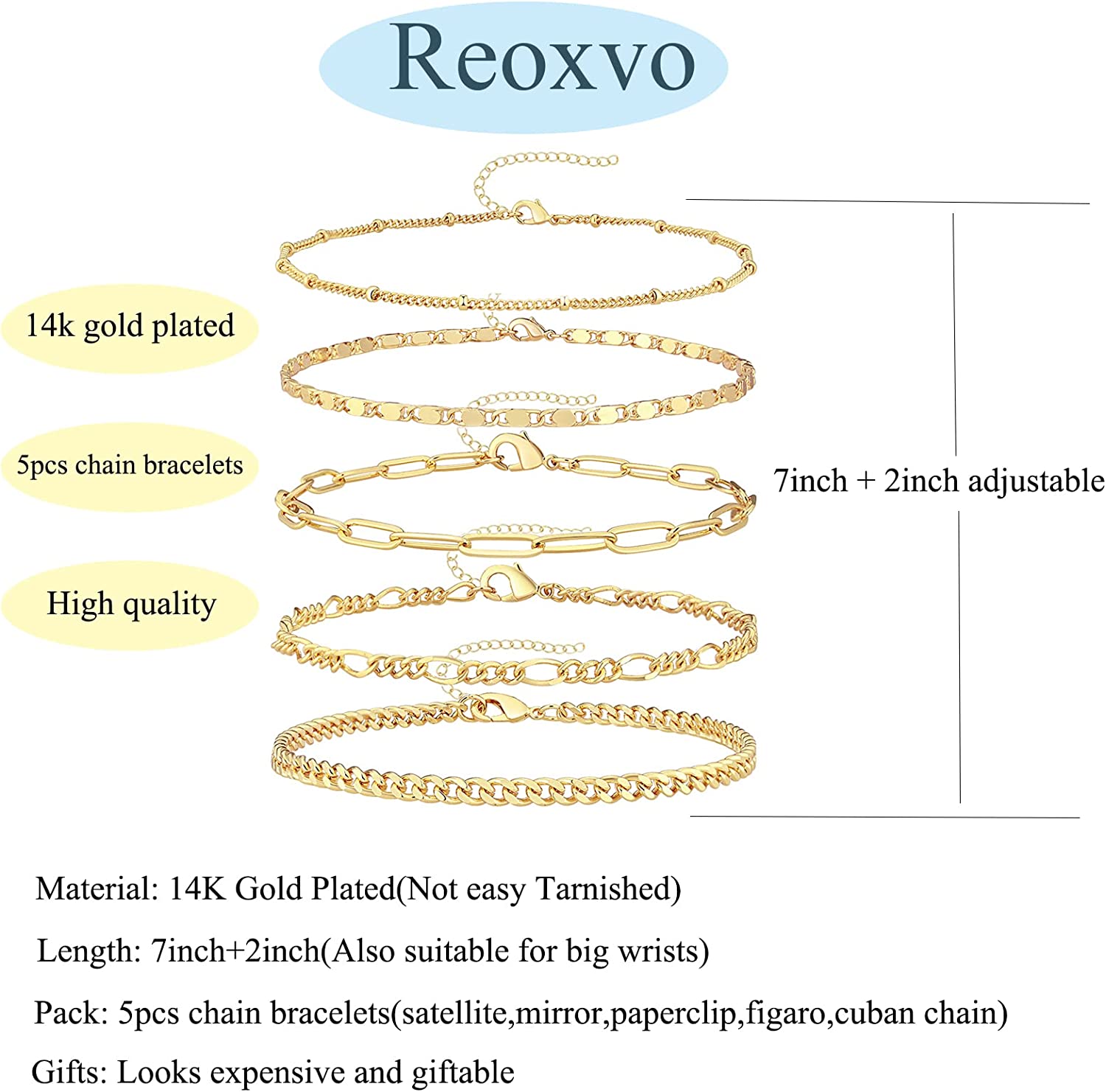 Reoxvo Dainty Gold Chain Bracelets Set for Women 14K Real Gold Plated Link Chain Bracelets for Women Trendy Gold Stackable Bracelets for Women Adjustable 7"+2"