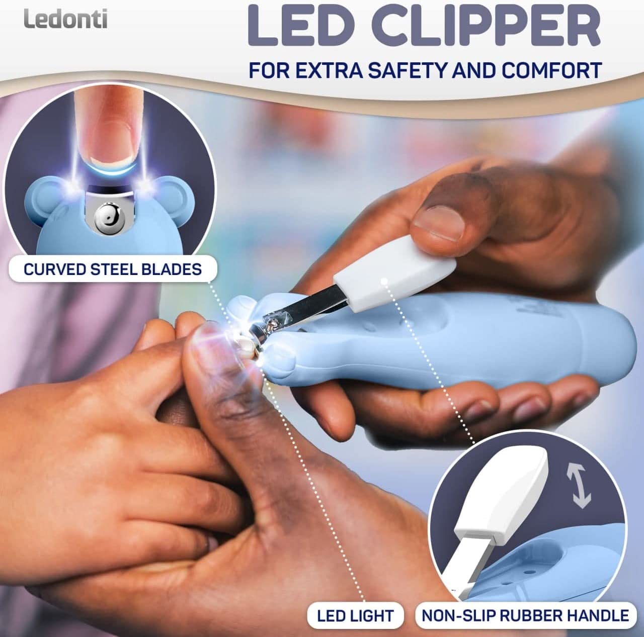 ALL-IN-ONE BABY NAIL KIT for safe nail care of babies, kids, and their parents. Baby nail trimmer electric LED with 6 replaceable grinder heads and sandpapers. Safety clippers with curved steel blades and LED light. Ultra-safe scissors with a protective cap. A convenient storage bag. Get a professional nail care set for the whole family.