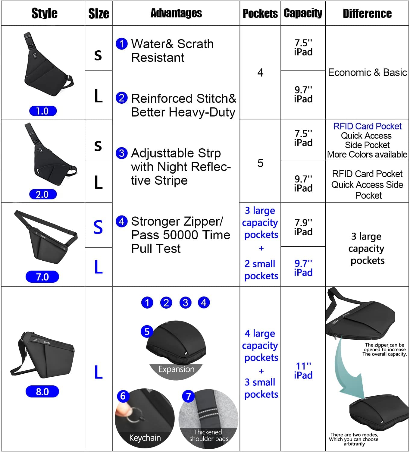 • [Side Wearing Backpack]:It can be used as a purse, a book bag,ipad bag, wearing on your shoulders instead of holding in your hand. Perfect chest pack for both lefties & righties,a mutifuctional shoulder strap bag.
