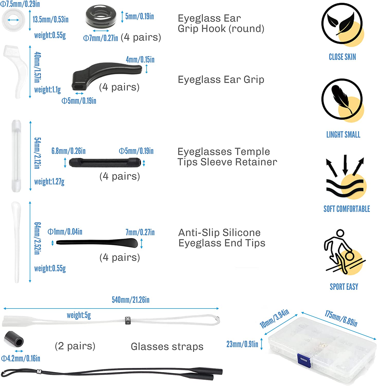 Safety Eyewear Retainers:we have 6 types 10 styles 18 pairs 34pcs (black and white),2 pairs x Sports Glasses straps,4 pairs x Eyeglass Ear Grip Hook,4 pairs x Eyeglass Ear Grip Hook (round),4 pairs x Eyeglasses Temple Tips Sleeve Retainer,4 pairs x Anti-Slip Silicone Eyeglass End Tips