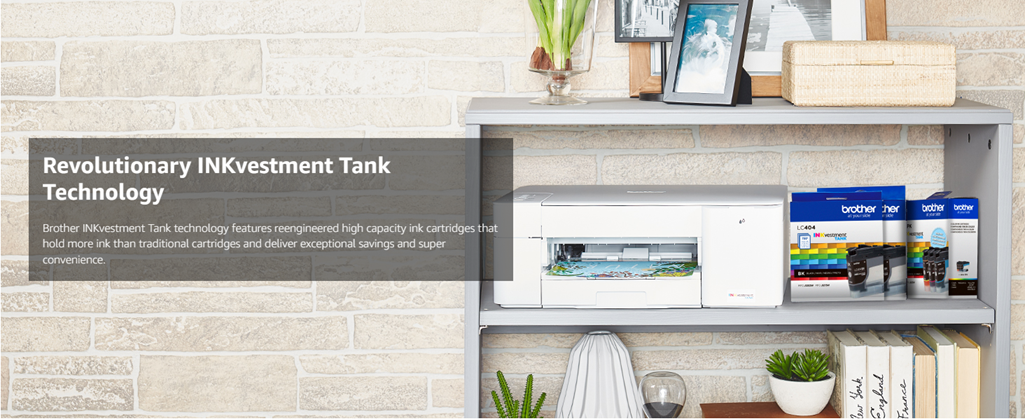 Get ready for a productive day with help from this Brother printer. The wireless printer offers easy mobile printing options, a Hi-Speed USB 2.0 interface and web-based printing for versatility. The color printer features a 150-sheet input tray to help your team print big jobs without having to constantly refill it. NO INK REPLACEMENT FOR UP TO 1-YEAR(1): Experience truly uninterrupted printing, exceptional savings and super convenience with up to 1-year of ink using only the four cartridges provided in-box.(1) PUT THE POWER OF PRINTING AT YOUR FINGERTIPS: The simple to use Brother Mobile Connect(2) App delivers easy onscreen menu navigation for printing, copying, scanning and printer management from your mobile device. BROTHER REVOLUTIONARY INKVESTMENT TANK SYSTEM: Brother INKvestment Tank printers feature reengineered ink cartridges that hold more ink than traditional cartridges and deliver a continuous ink supply for truly convenient, uninterrupted printing. ELIMINATE INK REPLACEMENT GUESSWORK: Print with confidence using the Brother Page Gauge,(3) a visual, numerical way to know the amount of ink used and the amount of ink remaining to help take the guesswork out of when to replace ink. USE BROTHER GENUINE INK: Engineered to work with INKvestment Tank inkjet printers, a full range of INKvestment Tank cartridges is available that deliver high quality prints and reliable page yields: LC404BK, LC404C, LC404M, LC404Y and LC404 3PK. BROTHER AT YOUR SIDE. Brother offers a 2-Year Limited Warranty and At Your Side support for the life of your printer. REFRESH: Buy Genuine Brother Ink Cartridges. When you do need to replace your ink supply, choose Brother Genuine LC404 inks. To avoid worrying about running out of ink again, get started with Refresh EZ Print Subscription service and save up to 50% on ink(5). DISCLAIMERS: (1)Based on average monthly print volumes of approx. 100 pages at 60% black/40% color pages in accordance with ISO/IEC 24711 using 4 cartridges