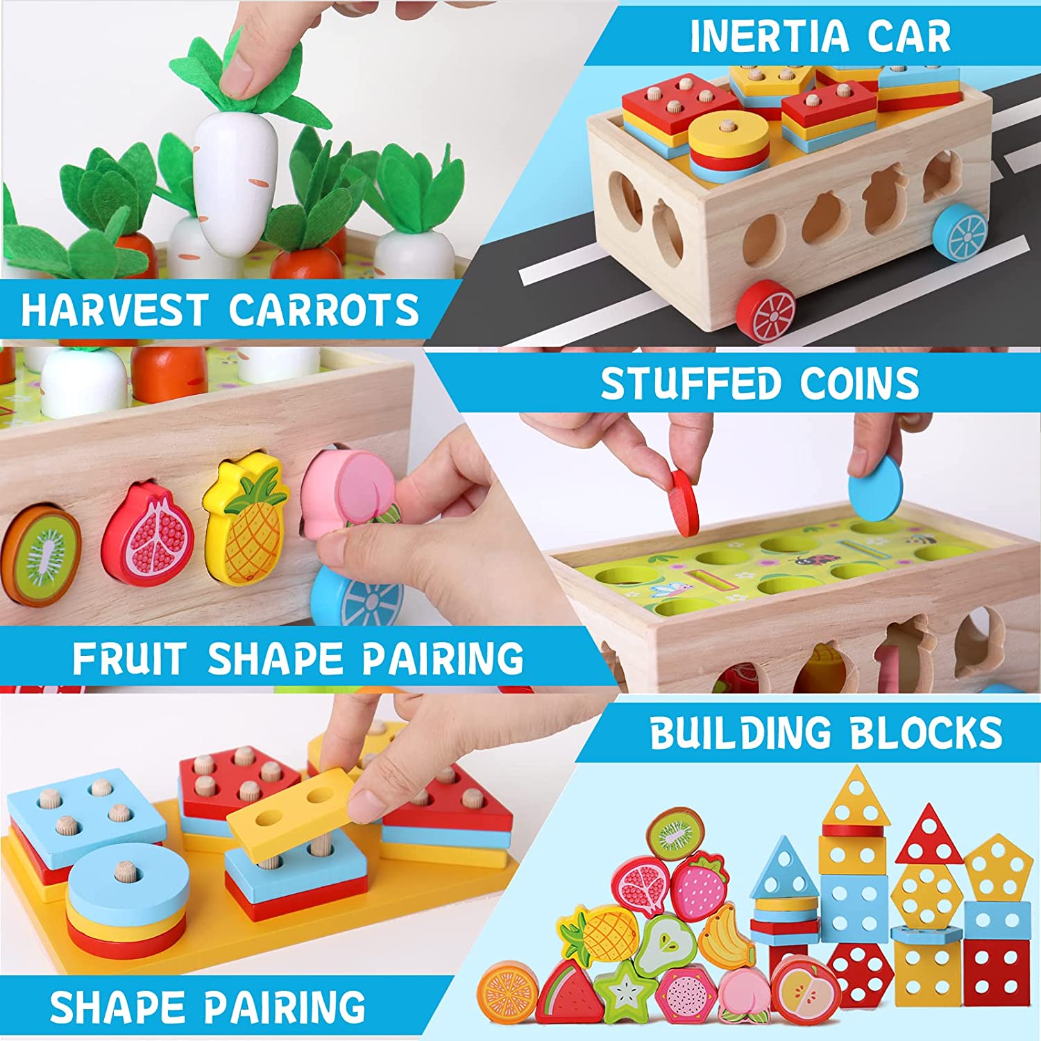 • Fine motor skills development for children: Montessori wooden toys are educational toys for children aged 2-4 years. Colorful fruit pattern blocks improve color, shape, and fruit recognition. It helps build early shape, color, and size discrimination skills as babies try to match blocks to targets or make various combinations.