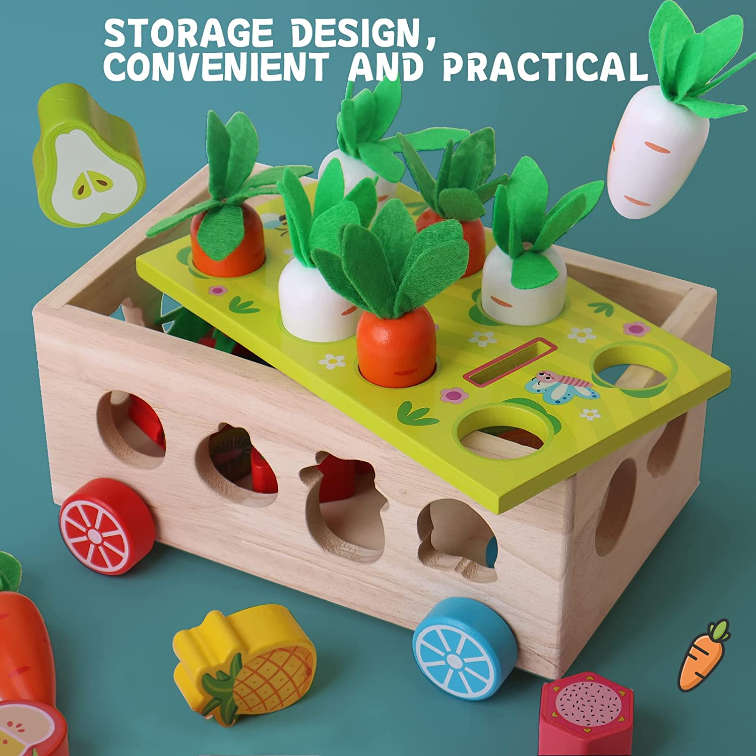 • Educational STEM Toys for Kids: Cute wooden farm toys that can be played with pulling radishes, fruit recognition, shape matching, pushing, color recognition, rabbit catching bugs, storage, sorting, great toys for little girls and boys 3-5 years old. A variety of ways to play can make your baby happier.