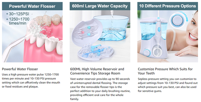 - 【600ml Water Tank and Leak Proof Design】The water tank uses double sealing rings to reliably prevent water leakage. 600ml large water capacity, no need to stop and add water when using. The vacuum cup at the bottom of the dental floss can be adhered to smooth, non-porous surfaces such as tiles, glass, marble, etc. 12 months replacement guarantee satisfaction. The best choice for the whole family