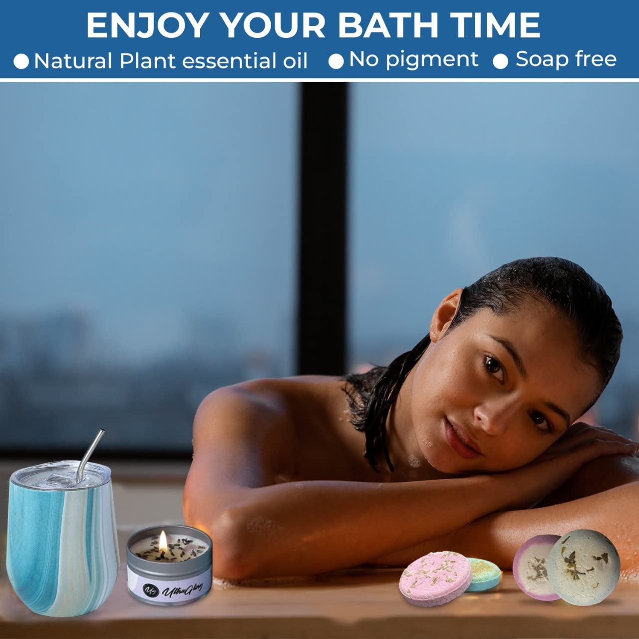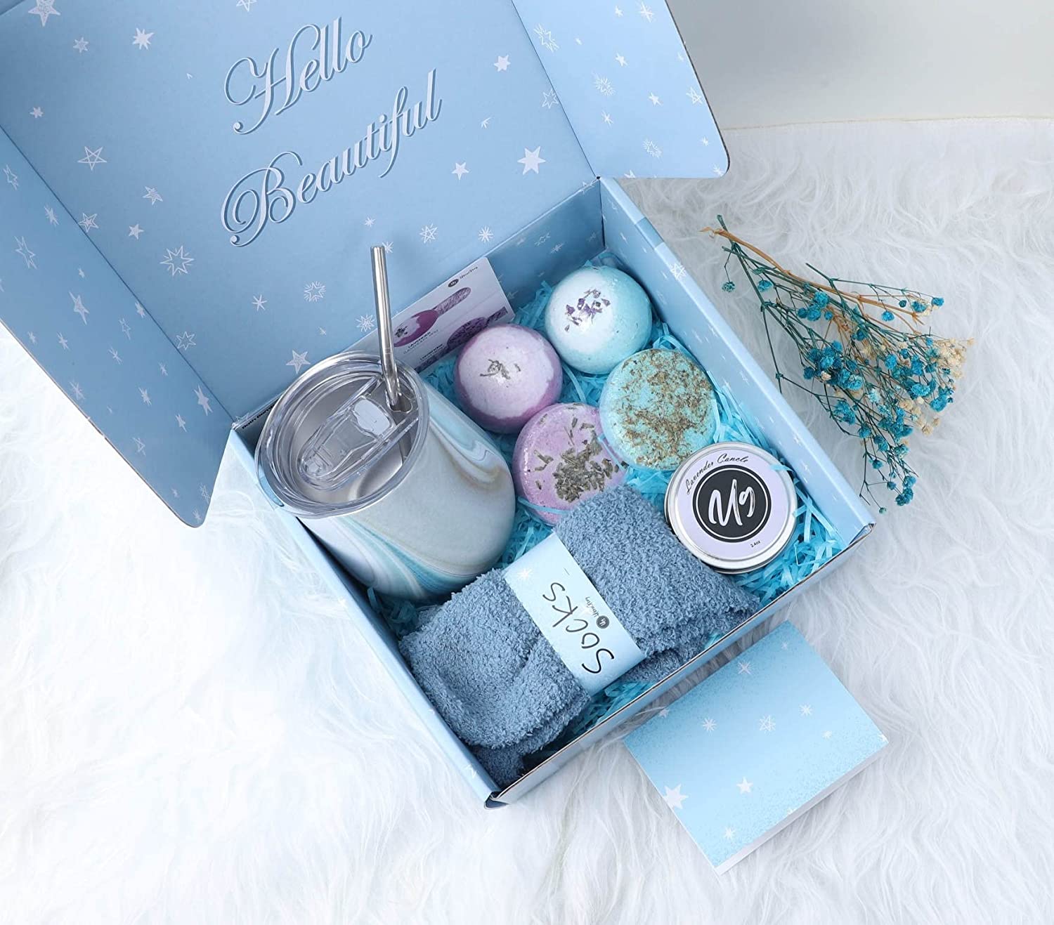 • ?【WHAT'S INCLUDED】 These bath gifts for women who have everything include everything a lady needs to experience a genuine SPA-like sensation from her own home! You’ll receive: wine tumbler, straw, straw cleaner, 2 bath bombs, 2 shower steamers, a pair of ultra-soft and comfy socks, aromatherapy candle, thank you card, everything in a superb light blue gift box!