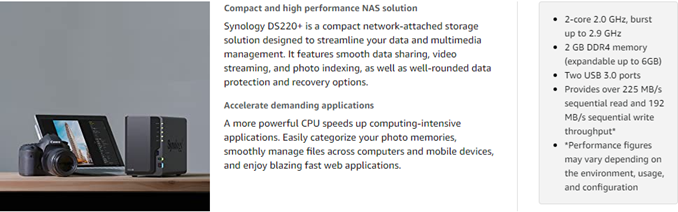 Synology DiskStation DS220+ is a compact network-attached storage solution to streamline your data and multimedia management. It features smooth data sharing, video streaming, and photo indexing, as well as well-rounded data protection and recovery options. File or folder level data restoration makes data recovery fast and flexible.