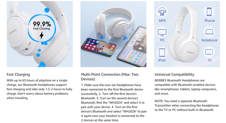 - ?【Latest Bluetooth 5.3 and Microphone】Carrying latest Bluetooth 5.3 chip, after booting, 1-3 seconds to quickly pair bluetooth. Beribes bluetooth headphones with microphone has faster and more stable transmitter range up to 33ft. Two smart devices can be connected to Beribes over-ear headphones at the same time, makes you able to pick up a call from your phone when watching movie on your iPad without switching