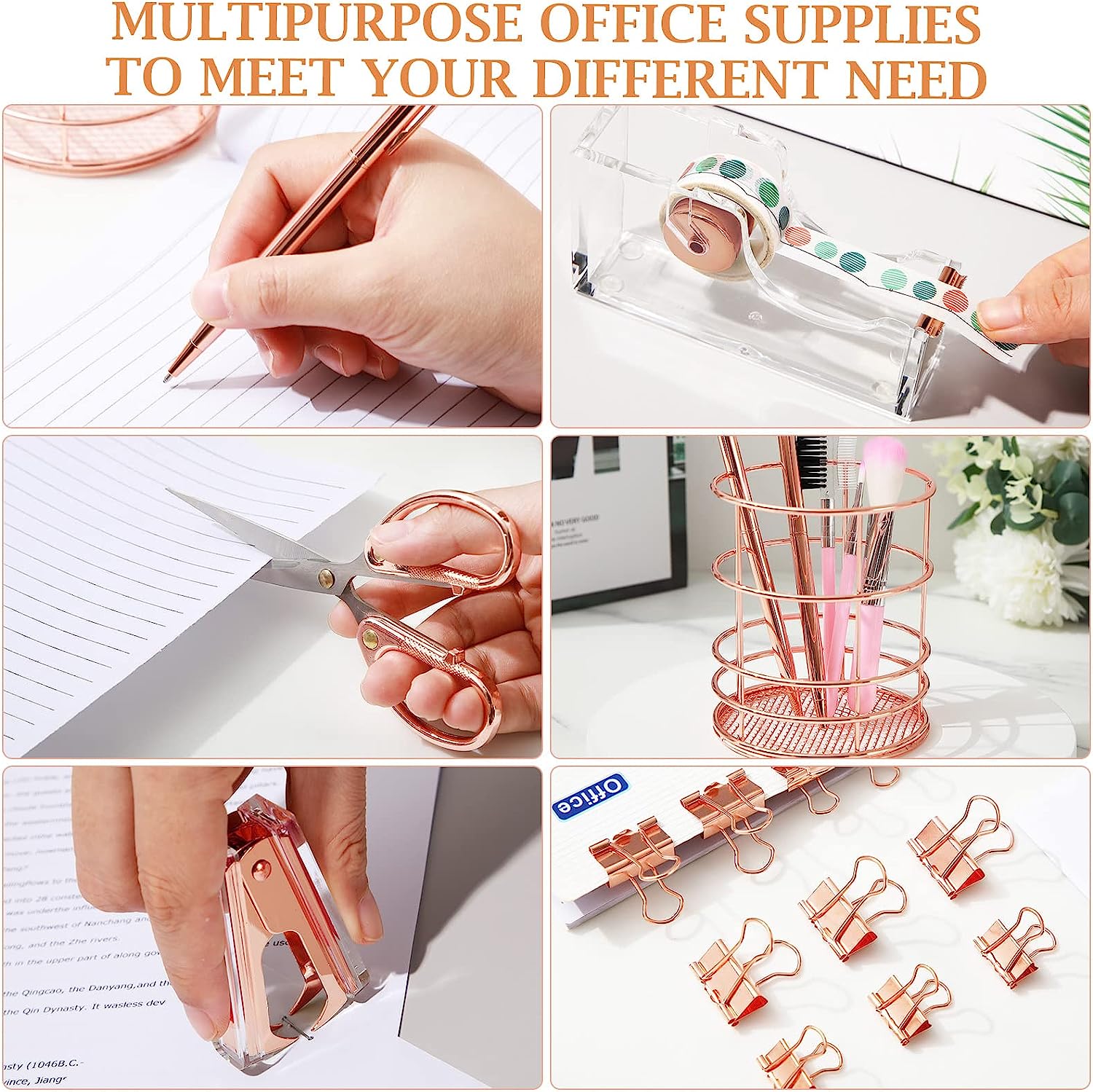 - Nice Combination: you will receive 1 piece of file holder, 1 piece of magazine file organizer, 1 piece of acrylic stapler, 1 piece of staple remover, 1000 pieces of staples, 1 piece of tape dispenser, 1 piece of pen holder, 2 pieces of pens, 1 pair of scissor, and 1 box of binder clips; The rose gold office supplies set can meet your daily and work needs, keeping your desk or desk drawer organized