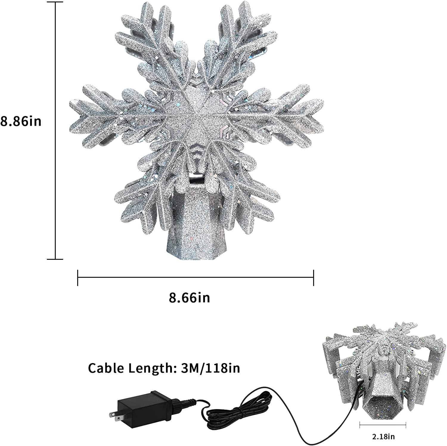 • 【Plug and Play Christmas Tree Topper】When you installation, just hanging the silver snowflake on top of the christmas tree, or place it on a table or wherever you want, plug it into the socket and it will cast a colorful snowflake pattern to decorate your christmas tree and your home.