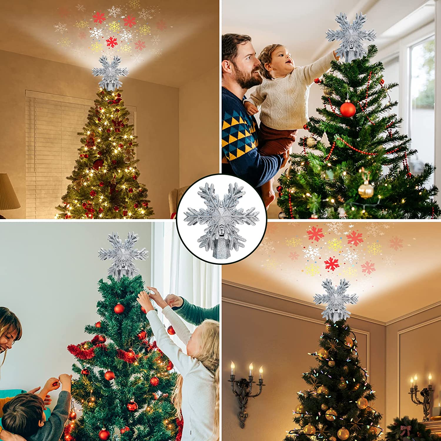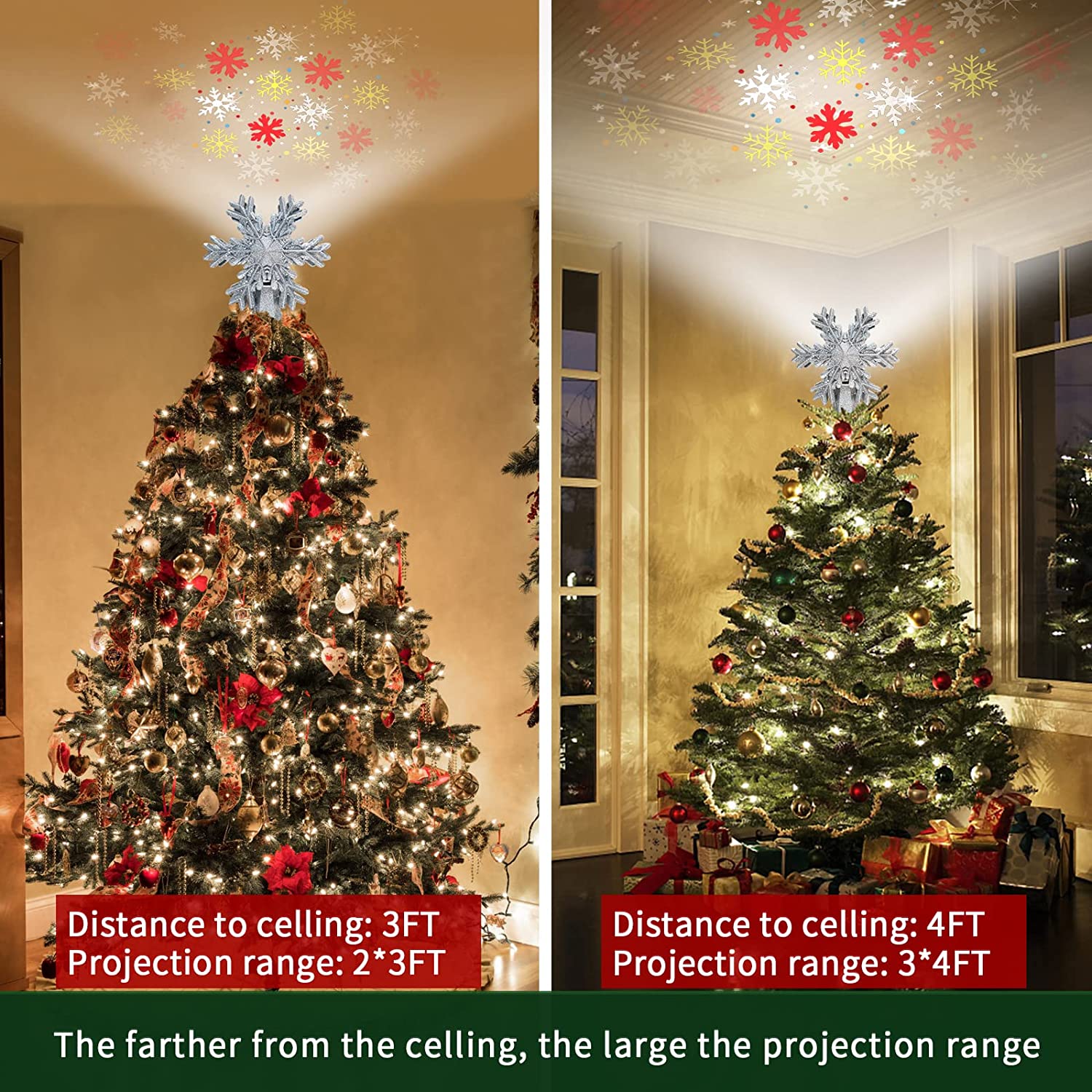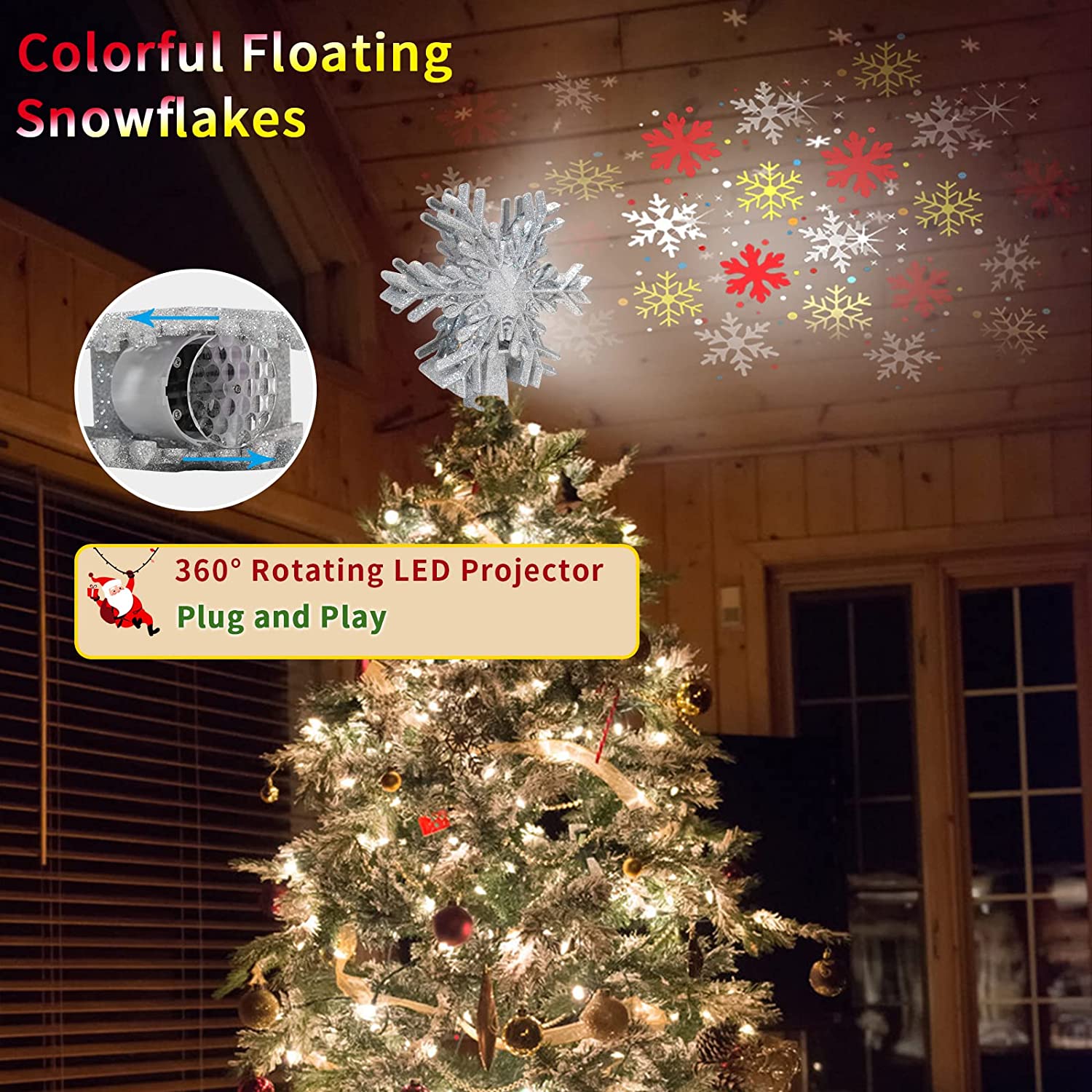 • 【Colorful Snowflake Glitter Christmas Tree Topper】This Christmas tree toppers is a nice decoration to Christmas tree. The Tree Toppers LED projector is built-in colorful snowflake projector, project high-definition colorful snowflakes and perfect dynamic colorful snowflake patterns. When you plug in the power, it will automatically rotate, projected on the ceiling.