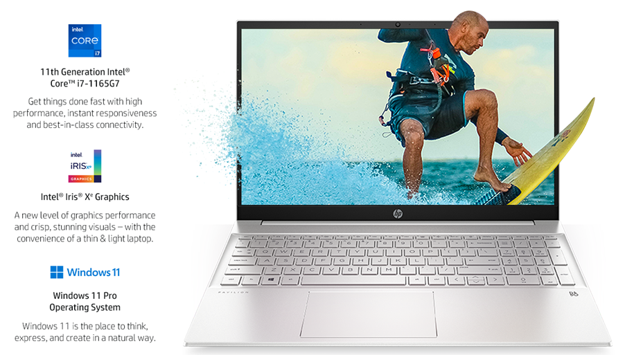 The HP Pavilion 15 Laptop has all the performance for mind-blowing entertainment you enjoy, but in a smaller, lightweight PC. The Full HD, IPS, micro-edge display combines with audio by BandO to give you robust, authentic theater-level entertainment (1). Intel Iris Xe Graphics (2) delivers the impressive performance needed for your creating, gaming, and entertainment while the 11th Generation Intel Core i7-1165G7 processor (3) gives you the instant responsiveness and best-in-class connectivity modern users crave. The HP Pavilion laptop’s 512 GB PCIe NVMe M.2 SSD storage outclasses traditional hard drives with 15 times the performance (4). Experience improved multitasking thanks to 16 GB of RAM. Work all day with up to 8 hours of battery life (5) and go from 0 to 50% charge in approximately 45 minutes with HP Fast Charge (6). Windows 10 Pro blends seamlessly and powerfully with this HP 15 Laptop for an optimized computing experience (7). Get more done with solid connection speeds from the powerful Wi-Fi 6 (2x2) (9) and Bluetooth 5.0 combo (10) and work comfortably with the familiar feel of a full-sized keyboard. Your HP laptop checks all the boxes with a 1-year limited hardware warranty, ENERGY STAR certification (12), EPEAT Silver registered (13), and a low halogen display (14). (1) Full High Definition (FHD) content is required to view FHD images. (2) Shared video memory (UMA) uses part of the total system memory for video performance. System memory dedicated to video performance is not available for other use by other programs. (3) Multi-core is designed to improve the performance of certain software products. Not all customers or software applications will necessarily benefit from the use of this technology. Performance and clock frequency will vary depending on the application workload and your hardware and software configurations. Intel’s numbering, branding, and/or naming is not a measurement of higher performance. Intel, Pentium, Intel Core, Celeron, Iris Xe, Intel logo, and the Intel Inside logo are trademarks of Intel Corporation in the U.S. and other countries. (4) Based on HP internal testing using CrystalDiskMark benchmarking software. Performance is sequentially faster (read-only) compared to traditional 5,400 rpm HDD. (5) Windows 10 MobileMark 18 battery life will vary depending on various factors including product model, configuration, loaded applications, features, use, wireless functionality, and power management settings. The maximum capacity of the battery will naturally decrease with time and usage. See bapco.com/products/mobilemark-2018/ for additional details. (6) Recharges your battery up to 50% within 45 minutes when the system is off (using “shut down” command). Recommended for use with the HP adapter provided with the notebook, not recommended with a smaller capacity battery charger. After charging has reached 50% capacity, charging speed will return to normal speed. Charging time may vary plus/-10% due to System tolerance. (7) Not all features are available in all editions or versions of Windows. Systems may require upgraded and/or separately purchased hardware, drivers, software, or BIOS update to take full advantage of Windows functionality. Windows 10 is automatically updated, which is always enabled. ISP fees may apply and additional requirements may apply over time for updates. See microsoft.com (8) Upgrade rollout plan is being finalized and is scheduled to begin late in 2021 and continue into 2022. Specific timing will vary by device. Certain features require specific hardware, see http://www.Microsoft.com/windows/windows-11-specifications (9) Wireless access point and internet service required and sold separately. Availability of public wireless access points limited. Wi-Fi 6 (802.11ax) is backwards compatible with prior 802.11 specs. The specifications for Wi-Fi 6 are draft and are not final. If the final specifications differ from the draft specifications, it may affect the ability of the notebook to communicate with other Wi-Fi 6 devices. Only available in countries where 802.11ax is supported. (10) Bluetooth is a trademark owned by its proprietor and used by Hewlett-Packard Company under license. (11) Based on Wi-Fi 5 80MHz and Wi-Fi 6 160MHz minimum requirements when transferring files between two devices connected to the same router. Requires a wireless router, sold separately, that supports 802.11ax (Wi-Fi 6). Only available in countries where 802.11ax is supported. (12) ENERGY STAR and the ENERGY STAR mark are registered trademarks owned by the U.S. Environmental Protection Agency. (13) Based on U.S. EPEAT registration according to IEEE 1680.1-2018 EPEAT. EPEAT status varies by country. (14) External power supplies, power cords, cables, and peripherals are not Low Halogen. Service parts obtained after purchase may not be Low Halogen.
