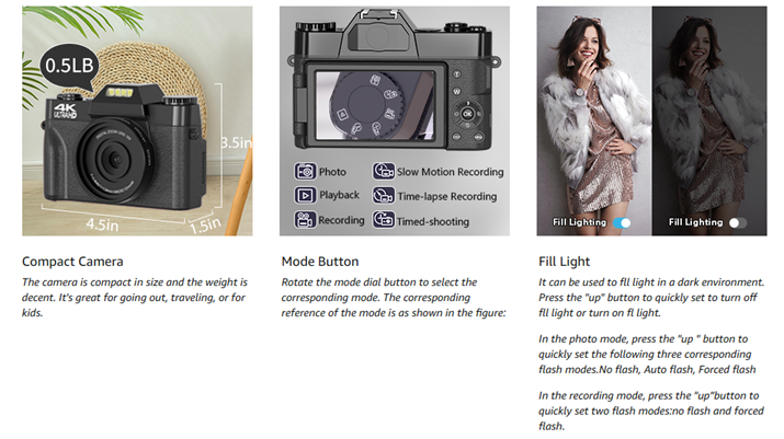 | Special Features | Slow motion, time lapse, photography, wifi camera, travel photography, beginner camera, 4k camera, digital camera, digital camera for filming |