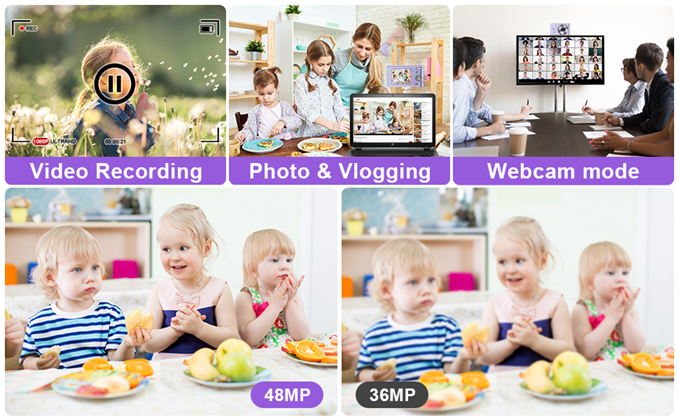 - 【Webcam & USB Transfer】Turn off the camera first, connect the camera with the computer through USB cable, press the power button and the mode button together, it will enter webcam mode. You can answer video calls or share your life on social media such as YouTube or Vlogging. After connect camera with computer by USB cable, the images and videos will transfer to computer automatically.