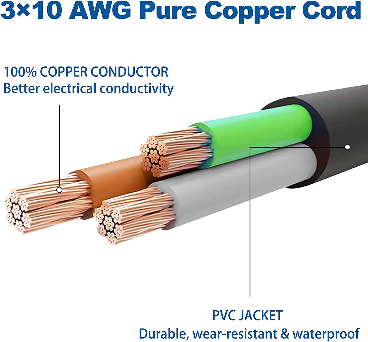 • ⚡【SAFE AND DURABLE CONSTRUCTION】The RV Power Extension cord is constructed with 100% copper wiring and weather resistant 10/3 Gauge STW jacket for Heavy duty, heat resistant PVC sheath that serves as protection from outdoor elements, wear and tear