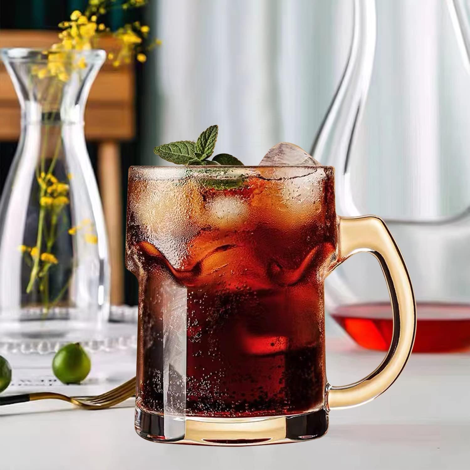Ergonomically Handle-Feature with ergonomically handle which is easy to take up and down,perfect size to fit your hand properly,easy to grasp while allowing comfortable use for you to enjoy your favorite drinks in this elegant glass mugs.