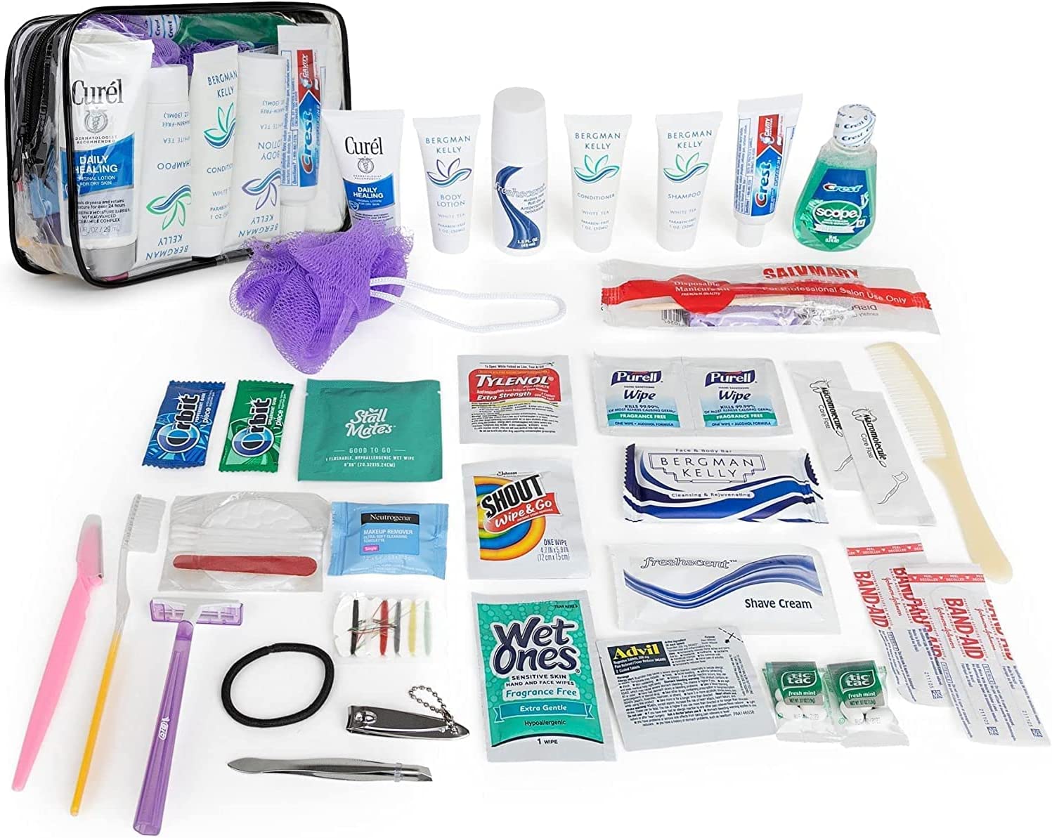 TOILETRY TRAVEL ESSENTIALS INSIDE - Professional Disposable Manicure Kit, Sewing kit pack, Toothpaste, Tooth brush, Mouth wash, Shampoo, Lotion, Soap, Deodorant, Shower sponge, Hand wipe, Hand cream, Tylnol, Advl, Cotton Pads, Cotton Swabs, Nail File, Nail clipper, Tweezers, Comb, Body wipes, Makeup remover, Elastic hair tie, Shout, Shavers, Shaving cream, Mint, Gum, Dental floss, Bandages