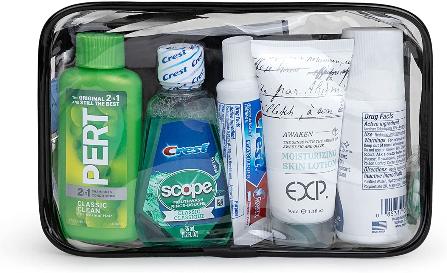 TSA APPROVED BATH - SHOWER HYGIENE TRAVLING KIT - Toiletry bag is transparent and waterproof fully compliant with TSA rules and regulations, makes traveling save time quick and easy