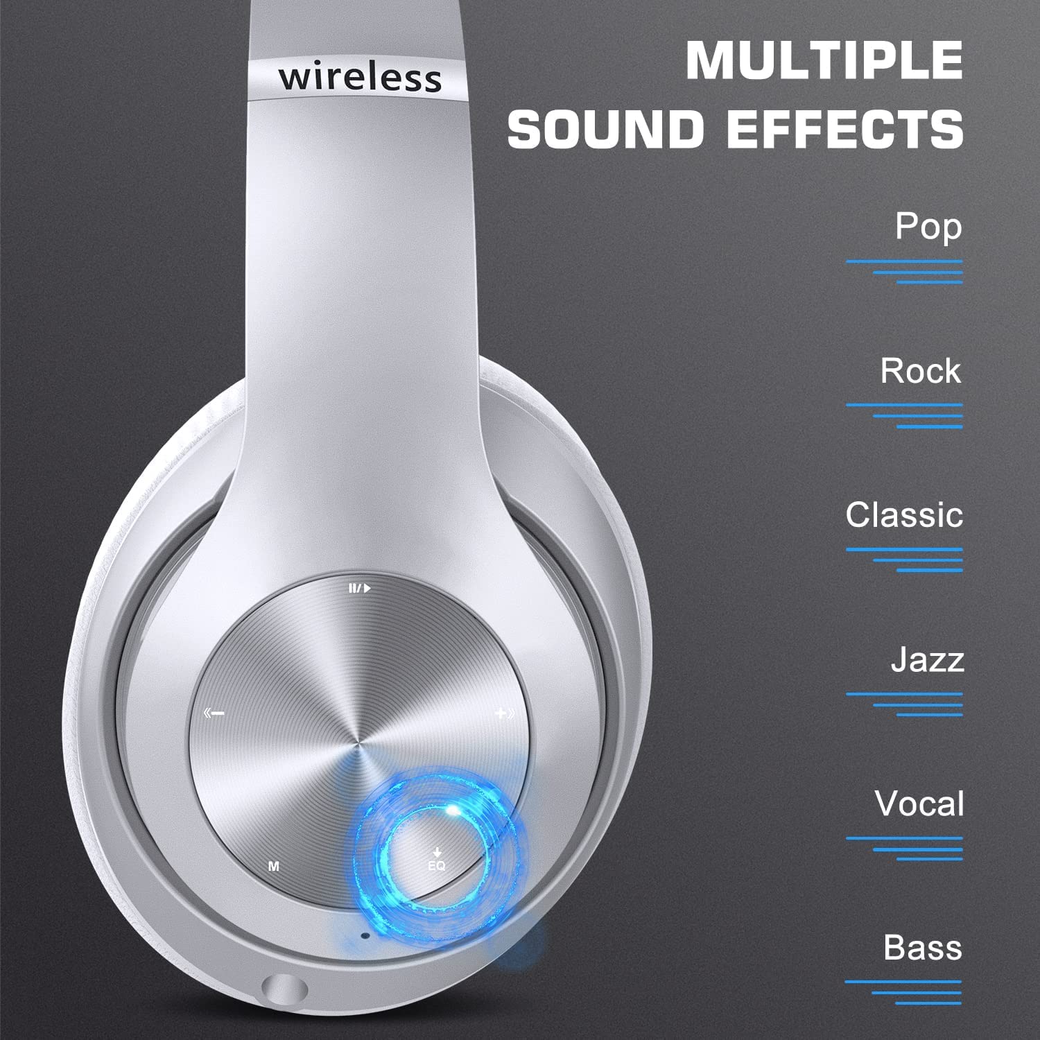 • 【HIFI STEREO & 6 EQ MODE】Our Bluetooth headphones over ear deliver High Fidelity Stereo sound results from dual 40mm drivers and ear cushion design, which both combining provide superior immersive HiFi sound quality. With 6 EQ modes, which make you can freely switch between Bass/Jazz/Voice/Rock/Pop/Classic sounds, each mode provides you with the CD quality sound.