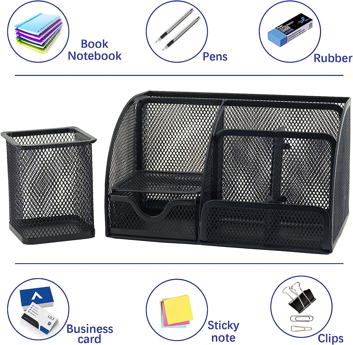 • [Durable and Versatile Design]This desktop organizer is not just for office supplies. Use it to store cosmetics, jewelry, mobile phones, business cards, and more. It's also a great choice for kids' desk organizers and storage. Made from lightweight mesh metal, this desk organizer is both sturdy and durable. The pen cup is designed to quickly store all kinds of pens and stationery.