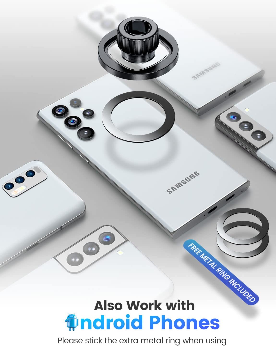 ?【Also Works for Other Non-MagSafe Phones】:If you have a non-magsafe android cell phone or iPhone 11/ 12 Series, please don't worry, just stick the extra metal ring on the phone or phone case to get strong magnetic power. Moreover, these including metal rings are compatible with wireless charging.