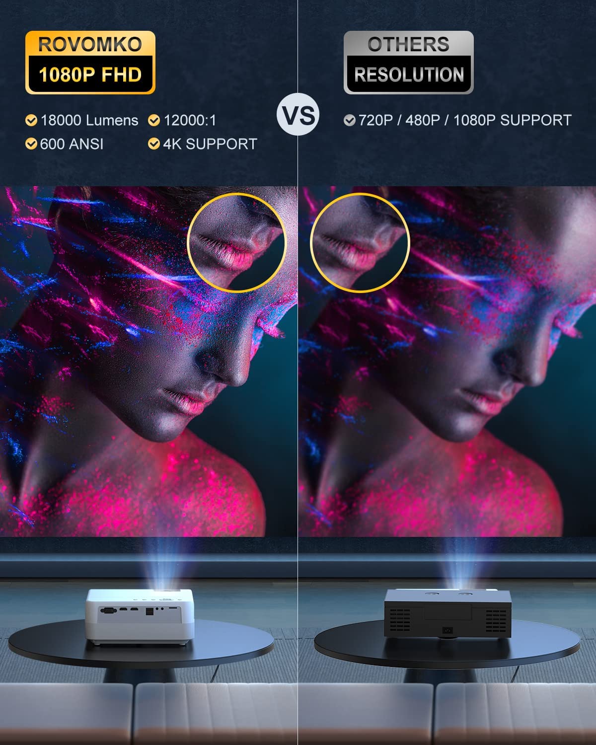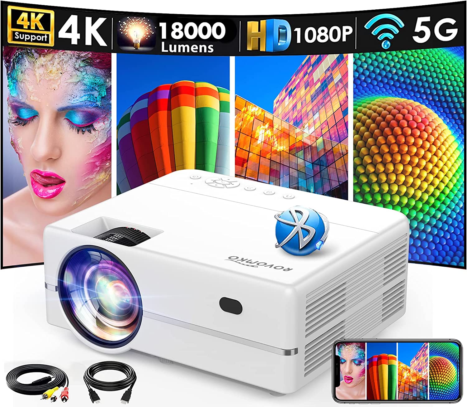 [Upgraded 2023] Projector, 1080P Projector with WiFi and Bluetooth, 600 ANSI 18000 Lumens, ROVOMKO Outdoor Movie Projector, Two-Way Bluetooth 5.1, 4K LED Projector Home Theater, Carry Bag Included