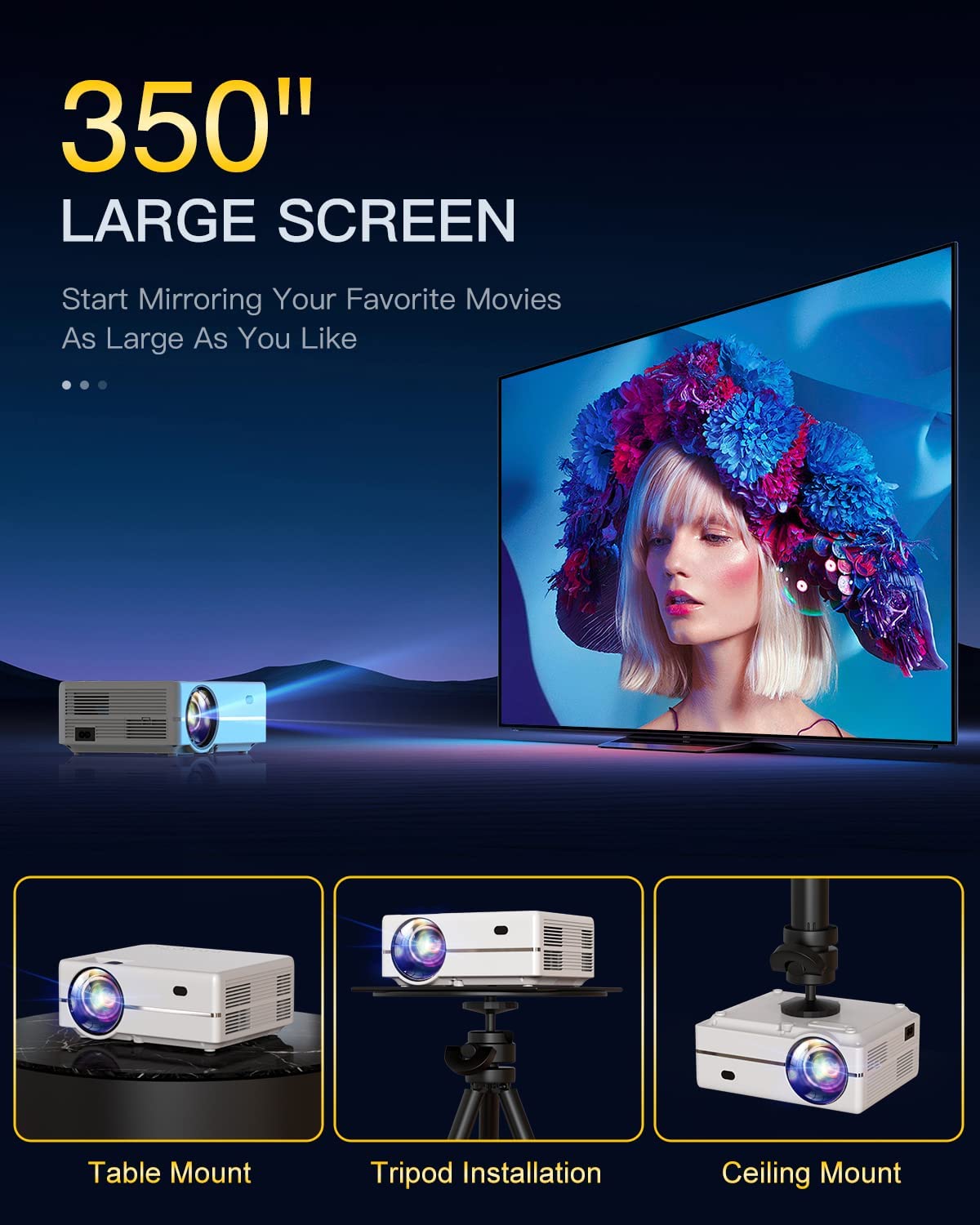 • ?Full High Definition: MKO26 bluetooth projector supports 4K decoding and boasts a native resolution of 1920 x 1080P, you can recreate the sights of the cinema from the comfort of your couch.?Join our fans club and you will have chance to get screens/stands/bluetooth speaker!?It is super exciting if we can provide something that makes your life better.