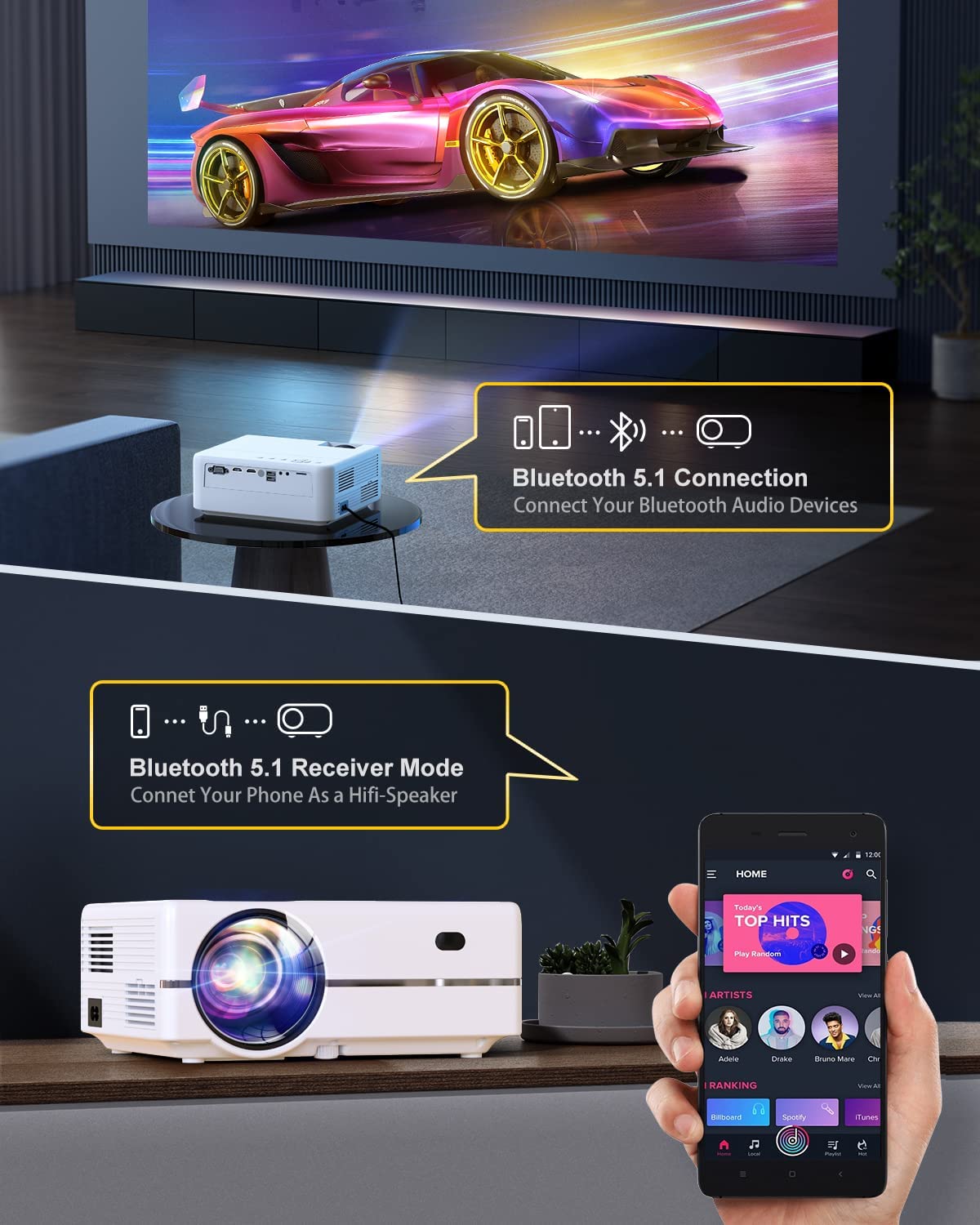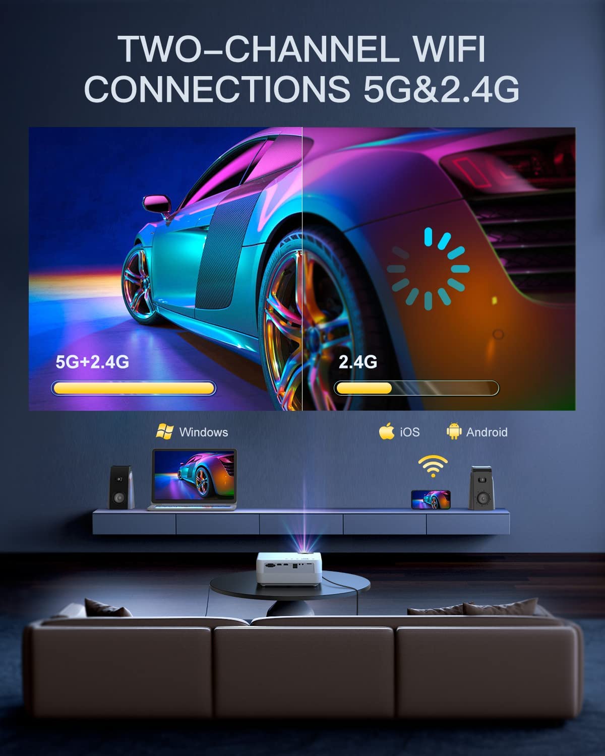 • ?Two-Channel Wifi&Two-Way BT 5.1 : MKO26 wifi projector provides 2.4G&5G dual-band WiFi connections, faster and smoother than other single-band projectors.With 2023 Upgraded built-in bidirectional bluetooth 5.1,connect your bluetooth audio devices at any time and MKO26's sound system can also double up as a bluetooth speaker .