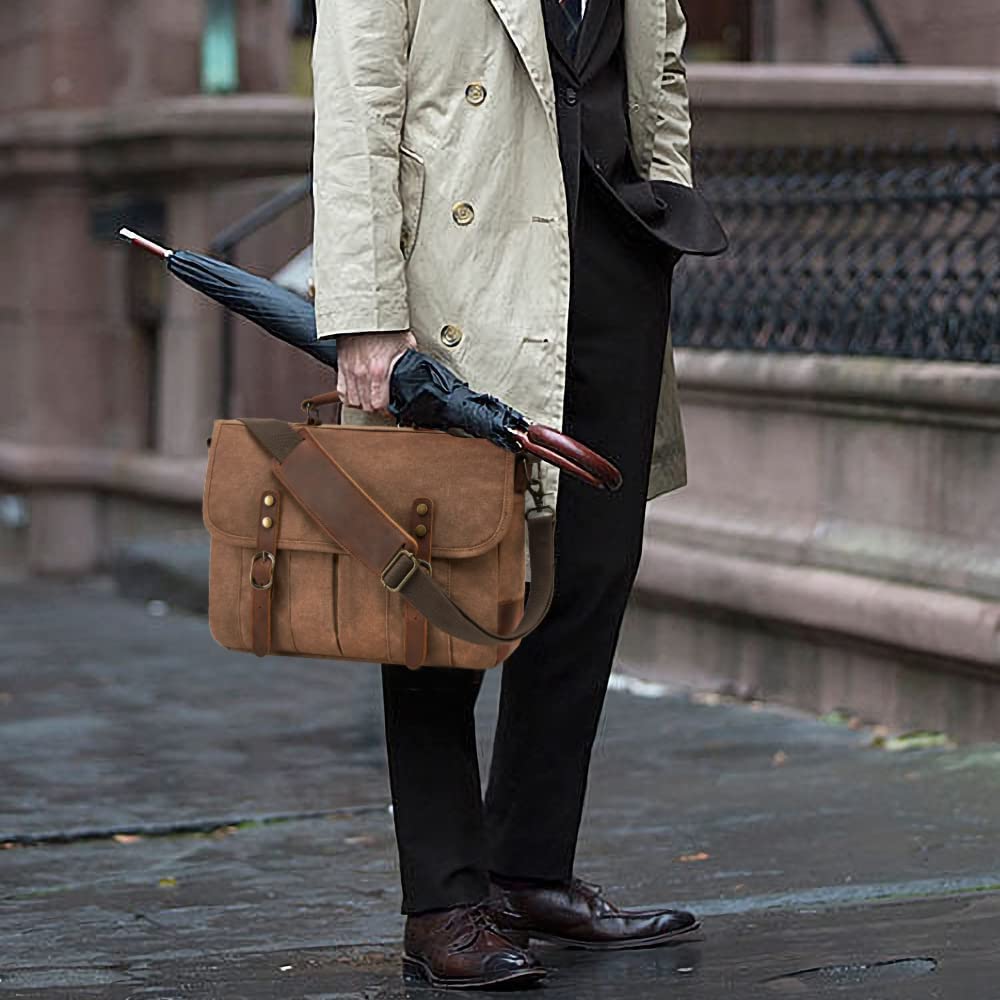 Mens Messenger Bag 15.6 Inch Waterproof Vintage Genuine Leather Waxed Canvas Briefcase Retro Office Computer Laptop Bag Large School Satchel Shoulder Bag for Men Women, Brown