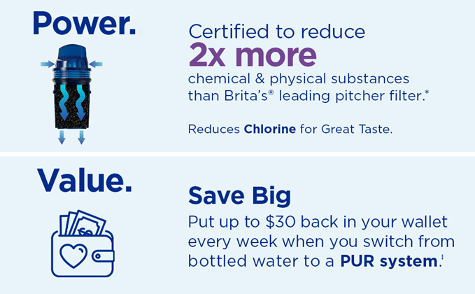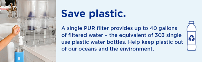 While home tap water may look clean, contaminants can get into your water through household plumbing. The PUR 44-Cup Filtered Water Dispenser offers refreshing water, quickly and easily. It’s an extra-large capacity water filter dispenser that holds up to 2.75 gallons – the largest capacity dispenser available! It includes 2 filters to last twice as long and filter twice as fast and a filter change light for replacement reminders. The elevated, space-efficient design is ideal for placing on the kitchen counter for everyday use and entertaining. Plus, the removable stand features filter storage for up to 6 extra PUR filters. PUR’s superior filter technology uses activated carbon and ion exchange media and is certified to reduce 2x more contaminants than Brita's leading pitcher filter.*ƚ Each PUR water filter is certified to reduce Mercury and certain Industrial Pollutants as well as reducing chlorine (taste and odor) and more.ƚ Using a PUR water filter system can save up to $1,000 per year on average compared with the cost of bottled water** and help keep plastic bottle waste out of landfills. Each filter is certified for up to 40 gallons. Replace your filters less often than with a single-filter system. Replace every 4 months when the filter change light turns red. Generic and private filters are not tested or certified for use in PUR filters. Genuine PUR filters are the only filters certified to reduce contaminants when used with PUR systems.ƚ Disclaimers: ƚ PUR does not filter microbes *Versus best-selling Brita® pitcher filter OB03. Brita® is a trademark of Brita LP. **Based on comparing a year's worth of bottled water (16.9 oz) to a PUR Dispenser a year's worth of 9 refills. Based on Nielsen US Scantrack sales.