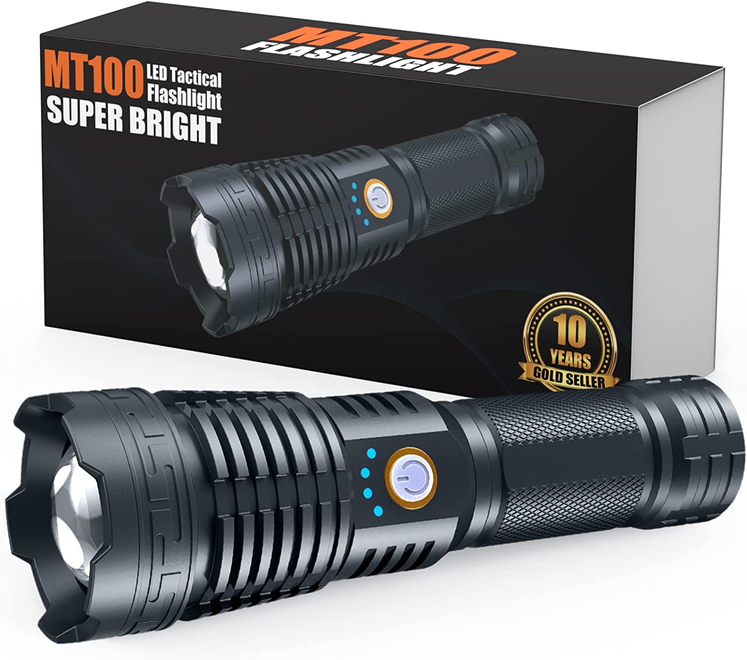 ?【SUPER BRIGHT RECHARGEABLE LED FLASHLIGHT】?MT100 high lumens flashlight uses upgraded XHP70.5 lamp beads, which can provide up to 150,000 lumens of brightness. The rechargeable led flashlight can reach a maximum irradiation distance of 3000 feet, or easily illuminate a wide area of 2000 square feet. The super bright flashlight allows you to easily see any strange things in the dark, so you no longer worry about the dark.