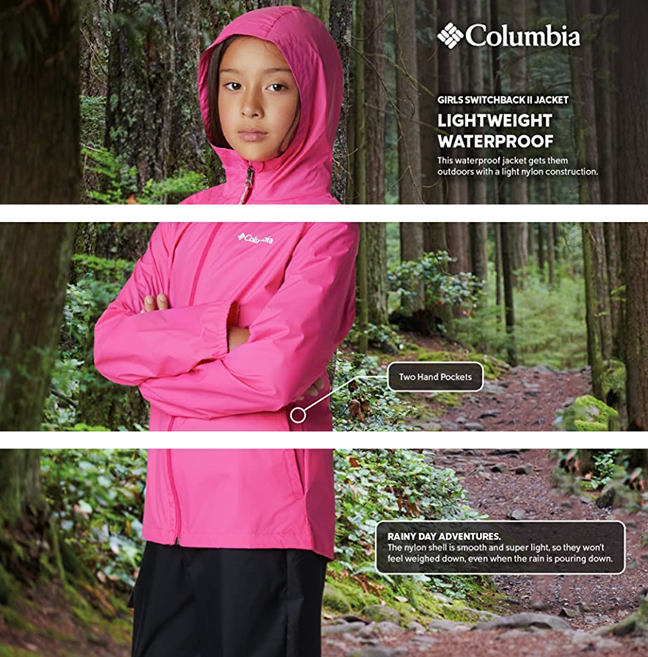 - COMFORTABLE RAIN JACKET: The Columbia Girl's Switchback II Jacket is a hooded waterproof rain coat with elastic cuffs, and a drop tail, designed to keep your child cozy and dry.