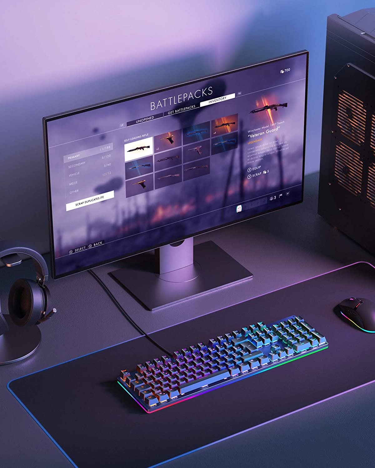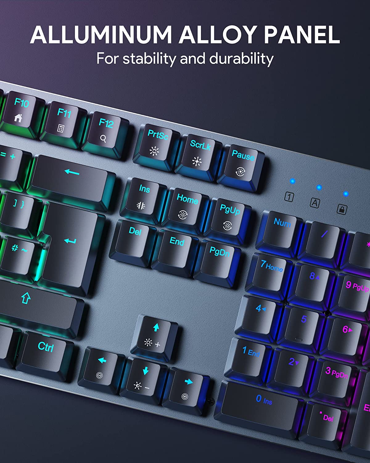 • HIGH-QUALITY KEYBOARD: UV coated keycaps and injection laser carving ABS keycaps design, the letter of characters never fade. Metal and ABS construction make it more solid and reliable, the mechanical switches have a 50-million-keystroke lifespan