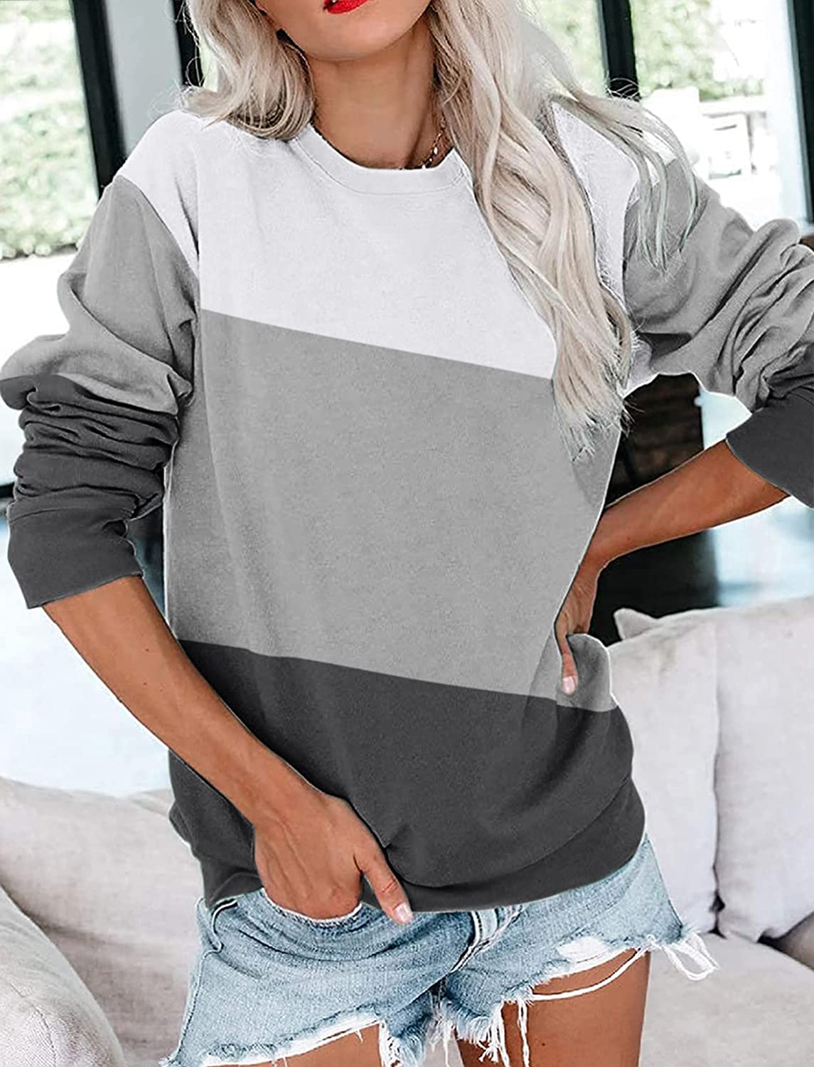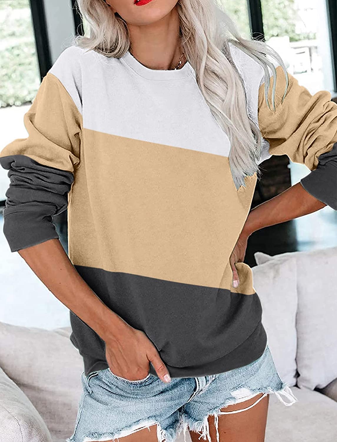 • 【Unique Designs】Long sleeve color block design, lightweight side pocketed sweatshirt, basic crew neck, casual relaxed fit. The stitching of three classic colors makes you look more lovely and charming.