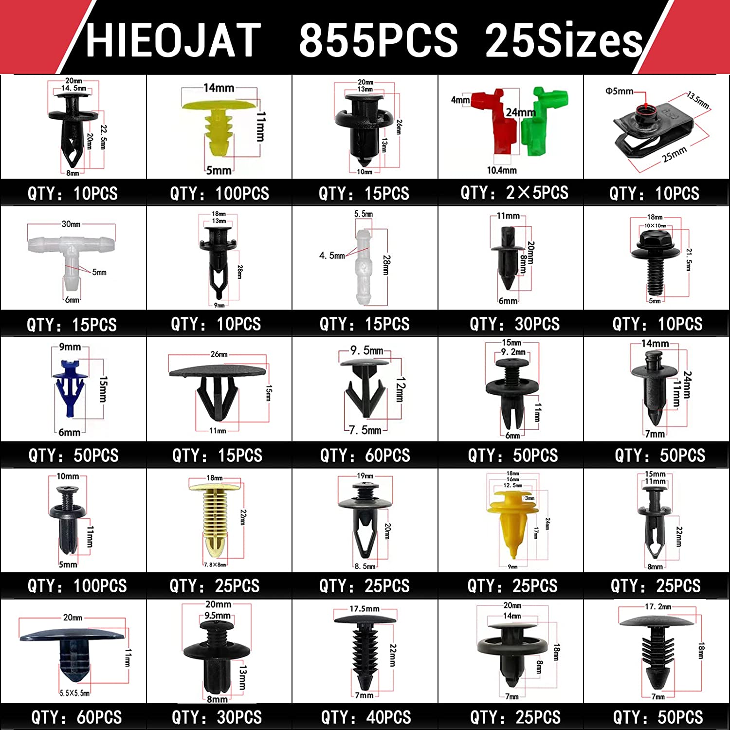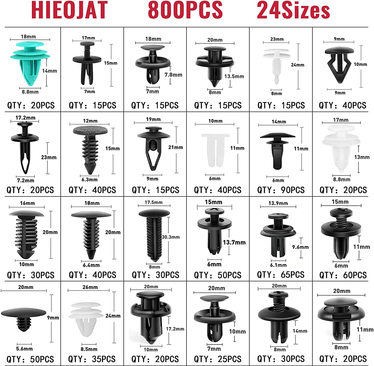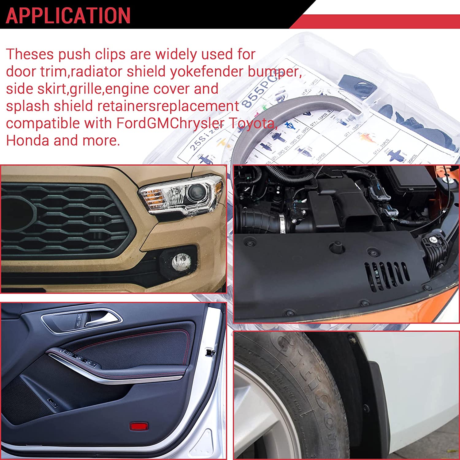 • 【910pcs car retainer push clips kit】 -Quantity: 910pcs/pack. Multi kinds of common size Suitable for for the trim panel clips, door trim clips, door panel clips,bumper clips,Fender clips,engine cover and splash shield retainers replacement.